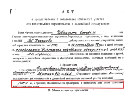 В подтверждение слов об определенности границ парка им. Ата-Тюрка Токтакунов и Ирискулбеков предъявили «Акт о предоставлении в пользование земельного участка для капитального строительства и дальнейшей эксплуатации», составленный в 1992 году. В документе говорится, что «главное архитектурно-плановое управление Фрунзенского горисполкома в лице начальника Т.С. Кенешова… на основании постановления Бишкекской городской госадминистрации от 25 июня 1992 года №225 предоставляет земельный участок площадью 107 га в границах, обозначенных на плане, составляющем с актом одно целое».