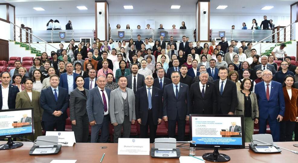 Ректор КазНУ Жансеит Туймебаев представил гостя как «учёного‑инженера, пришедшего в политику из лаборатории», отметив: «Акаев получил образование в Санкт‑Петербурге и Ленинградском институте точной механики и оптики, прошёл защиту кандидатской и докторской диссертации в Москве. Его научные и образовательные инициативы стали фундаментом для Кыргызстана».